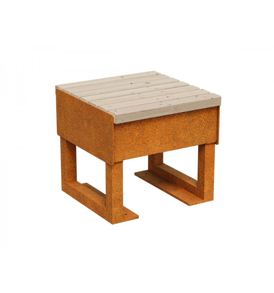 GORDO 1 have-/bybænk er en solid havebænk, lavet af 5 mm Cortenstål. Som standard kommer den med sæde af grantræ, som blev lakeret to gange med vores specielle mat lak. Bænken er udstyret med huller for en let montering i undergrunden.