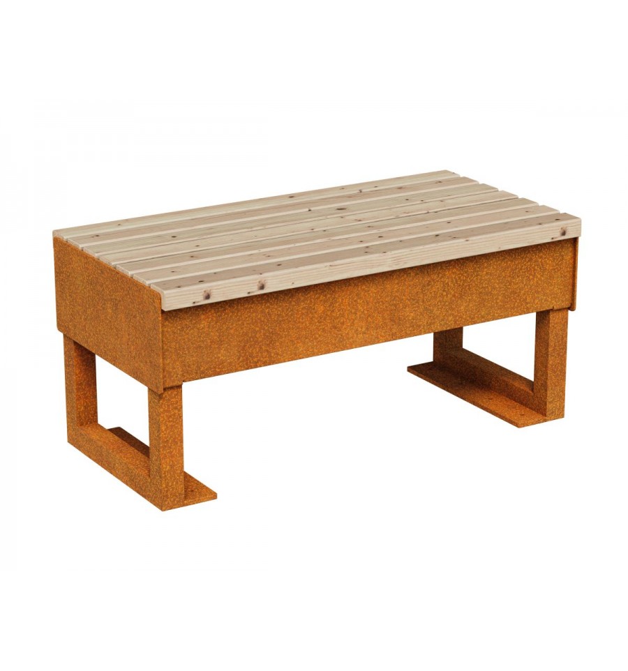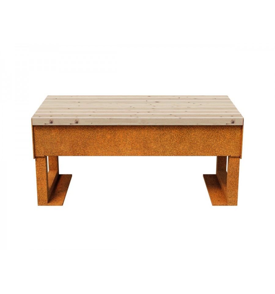 GORDO 2 have-/bybænk er en solid havebænk, lavet af 5 mm Cortenstål. Som standard kommer den med sæde af grantræ, som blev lakeret to gange med vores specielle mat lak. Bænken er udstyret med huller for en let montering i undergrunden.
