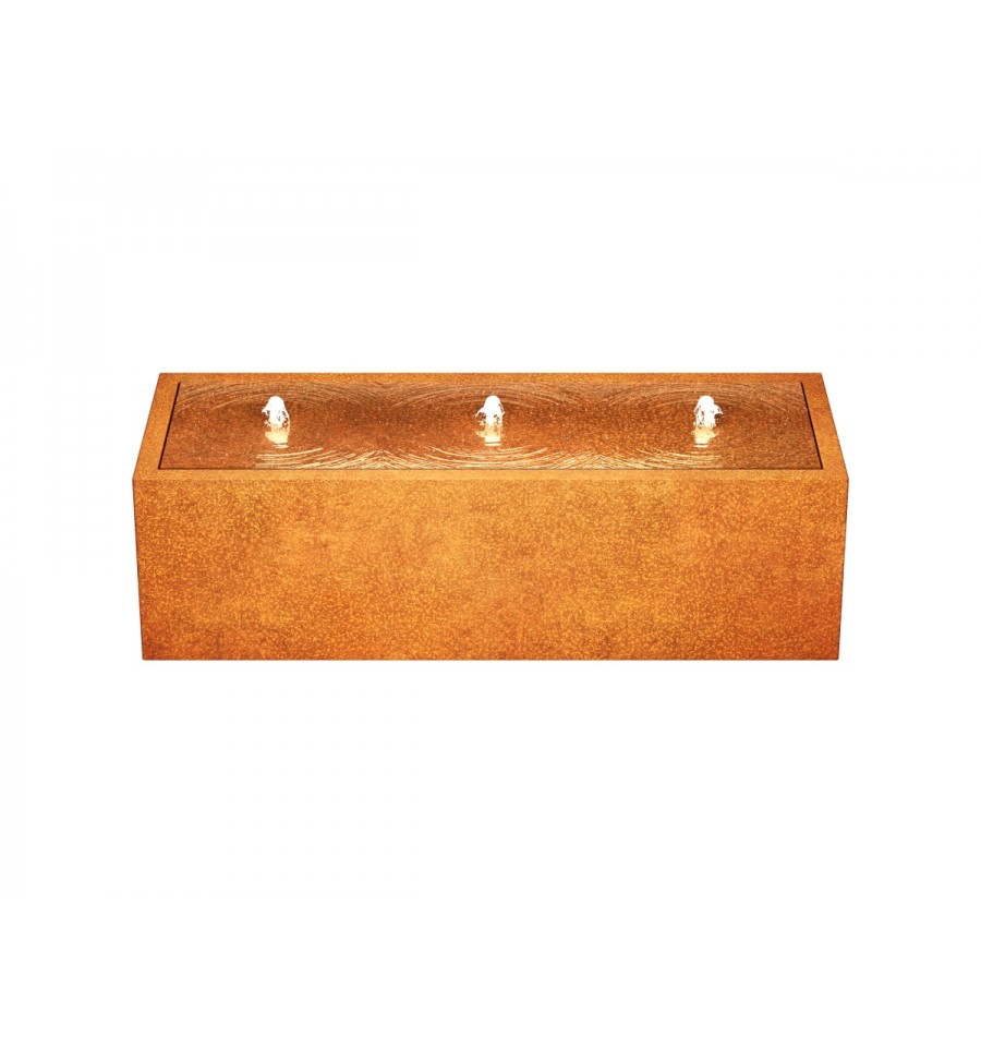 FUENTE FW4 ist ein geschlossener Gartenbrunnen. Es besteht aus 2 mm dickem Cortenstahl. Springbrunnen aus Cortenstahl sind sehr langlebig und wartungsfrei. Das Set enthält eine hochwertige Wasserpumpe und im oberen Teil sind LED-Leuchten mit Düse eingebaut. Das Set ist startbereit – Sie müssen lediglich Wasser in den Tank gießen und den Stecker an die Stromversorgung anschließen.