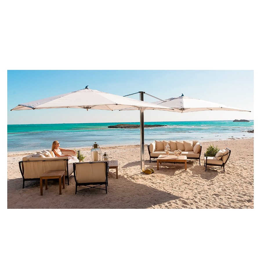 Im Ocean Master MAX Dual Ampelschirm von Tuuci® trifft Kunst auf Technik und verbindet beides auf harmonische Weise zu einer Schattenkomposition. Dieser exklusive Doppelschirm bietet großzügigen, luxuriösen Schatten, da auf diese Weise zwei einzigartige Outdoor-Wohnbereiche unter nur einem Schirm entstehen – Schatten ganz ohne Unterbrechung.