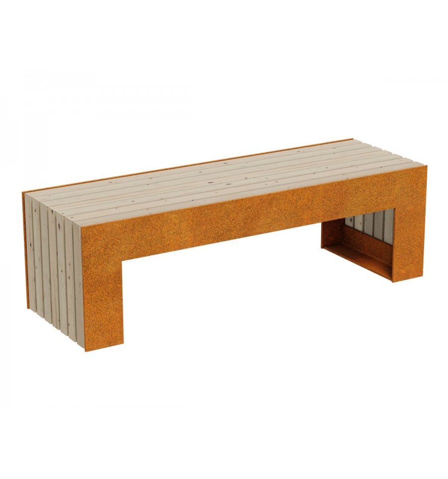 Die Garten-/Stadtbank MASETA 3 ist eine solide Gartenbank aus 8 mm Cortenstahl. Standardmäßig ist er mit einer Sitzfläche aus Fichtenholz ausgestattet, die zweifach mit unserem speziellen Mattlack lackiert wurde. Zur einfachen Montage im Untergrund ist die Bank mit Löchern ausgestattet.