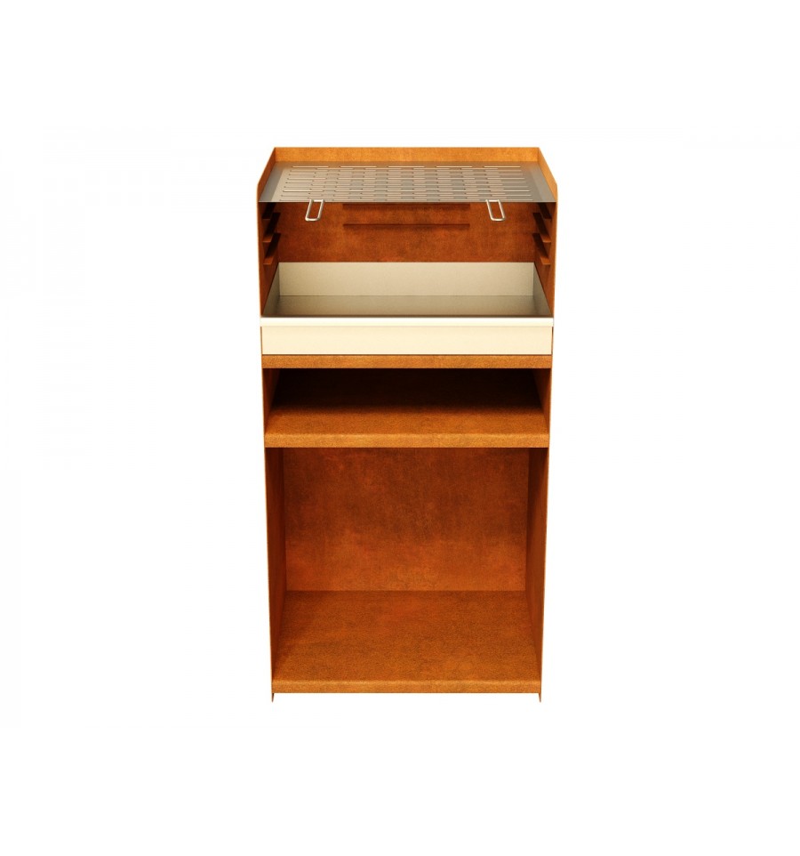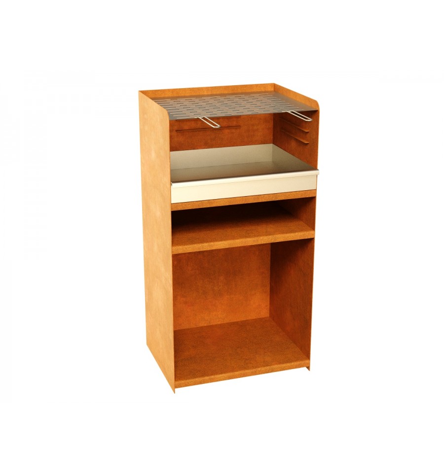 Corten GARDEN GRILL 3 ist ein mittelgroßer Grill, eine Feuerstelle und eine Außenküche in einem. Der Korpus besteht aus 3 mm Cortenstahl, die Grillplatte und der Rost aus Edelstahl – für den Kontakt mit Lebensmitteln geeignet. Der Grill hat einen herausnehmbaren Aschebehälter, der die Reinigung erleichtert. Wir haben ein Regal in den Ständer eingebaut, das als Organizer für Küchenutensilien oder einfach als Holzständer verwendet werden kann. Standardmäßig wird der Artikel mit verstellbaren Füßen geliefert, auf Kundenwunsch können jedoch auch Räder oder ein Stift mit Bremse verwendet werden. Perfekt für Profis und Amateure des Kochens in luftiger Höhe. Perfekt für Terrassen, Balkone, Gärten, Festivals oder andere organisierte Veranstaltungen.