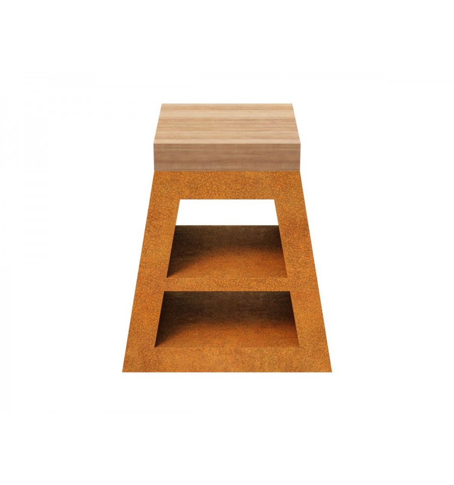 MESA 1 ist ein kleiner geometrischer Tisch aus Cortenstahl. Er ergänzt die COCCINA-Serie perfekt mit einer zusätzlichen Arbeitsplatte, einem Regal für Zubehör oder einem Platz für Holz. Standardmäßig mit verstellbaren Beinen ausgestattet, es ist jedoch möglich, Rollen zu montieren, um den Tisch mobiler zu machen. Er ist perfekt für Verkostungen, Präsentationen, Festivals oder einfach auf der Terrasse oder im Garten.