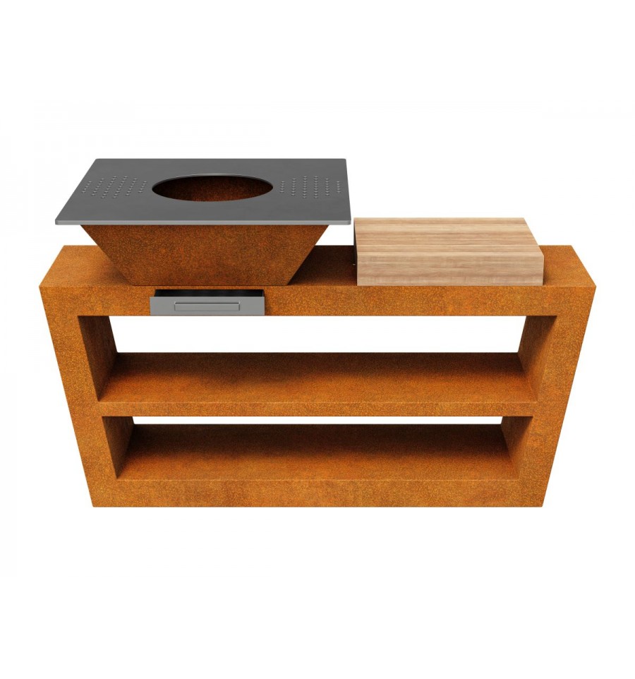 COCCINA 4 ist ein Trapezgrill, Feuerstelle und Outdoorküche in einem. Der Körper besteht aus Cortenstahl, die Grillplatte und der Grillrost aus Edelstahl – speziell für den Kontakt mit Lebensmitteln. Der Grill verfügt über einen abnehmbaren Aschebehälter, der die Reinigung erleichtert. Wir haben im Ständer ein Regal platziert, das als Organizer für Küchenutensilien oder einfach als Holzständer verwendet werden kann. Standardmäßig wird der Artikel mit verstellbaren Füßen geliefert, auf Wunsch des Kunden besteht die Möglichkeit, Räder oder einen Stock mit Bremse zu verwenden. Perfekt sowohl für Profis als auch für Amateure des Höhenkochens. Perfekt für Terrassen, Balkone, Gärten, Festivals oder andere organisierte Veranstaltungen.