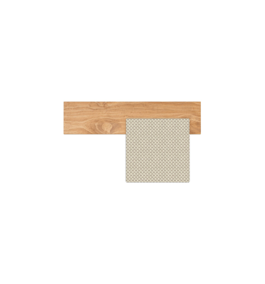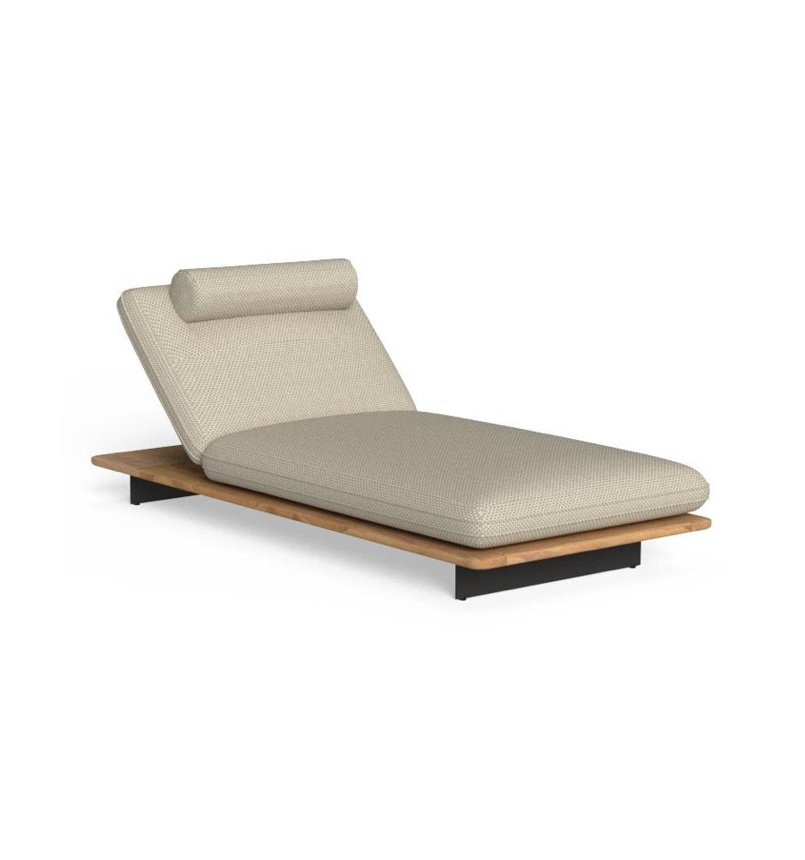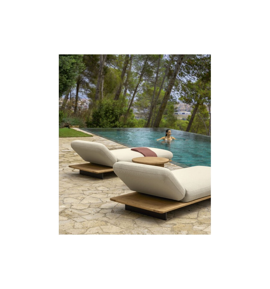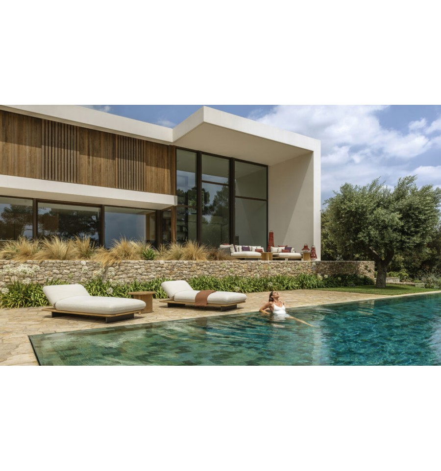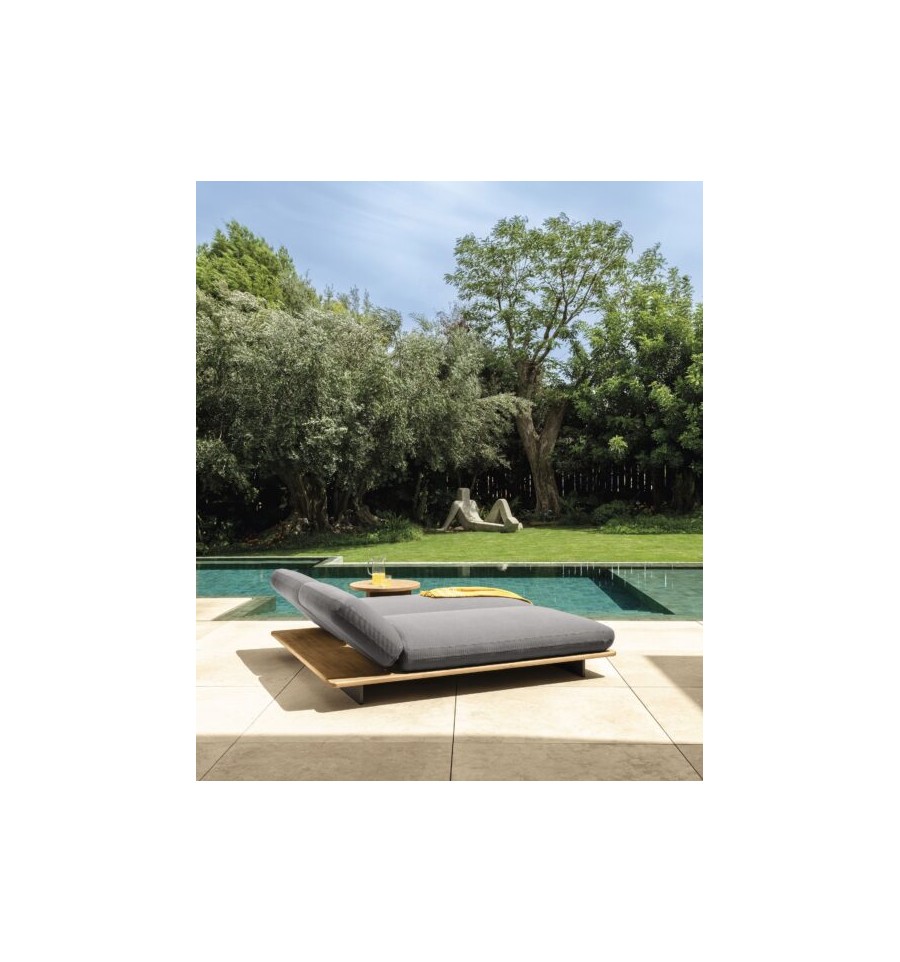 Die Sonnenliege Venice ist von den Booten inspiriert, die die venezianischen Wasserstraßen befahren. Das Kissen, das auf Holzsockeln mit schwebendem Design ruht, zeichnet sich durch weiche Linien und ein angenehmes, strapazierfähiges Material aus. Die Unterbauten aus Teakholz erinnern an die handwerklichen Ausführungen der Schiffe. Die Kombination dieser Elemente vermittelt ein Gefühl von Leichtigkeit und Charme, das die Momente der Entspannung im Garten oder am Pool begleitet.